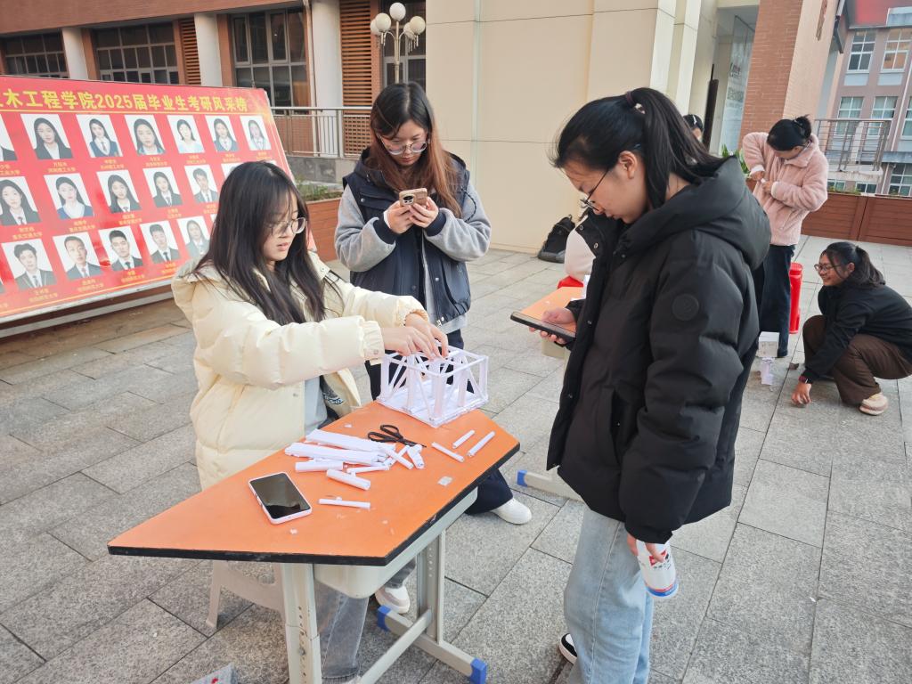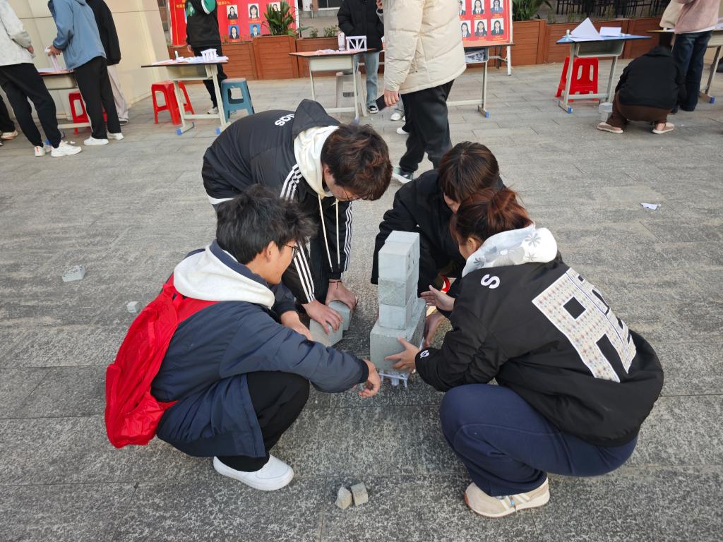 活动中,各参赛团队需在指定规则下完成作品创作,选用环保、低耗材料,既保证桥梁模型净跨度、高度等基础参数达标,又需兼顾结构稳定性与创意设计。参赛选手们利用硬纸板、胶水等材料,充分发挥自己的创新思维和动手能力,精心设计和制作桥梁模型。每一座桥梁模型都凝聚着选手们的心血和智慧,从结构设计到材料选择,再到细节打磨,无不体现出他们对专业知识的深入理解和巧妙运用。承重测试阶段采用砝码加载方式,以“承载重量与桥梁自重比值”为核心指标,记录模型在15秒内的稳定承重表现,部分优秀作品实现了轻量化与高承重的高效平衡。随后,钱文蹈老师对作品进行了细致的点评,不仅指出了每个作品的亮点和不足,还深入讲解了桥梁承重的原理和相关知识,让学生对桥梁设计有了更深入的认识和理解。