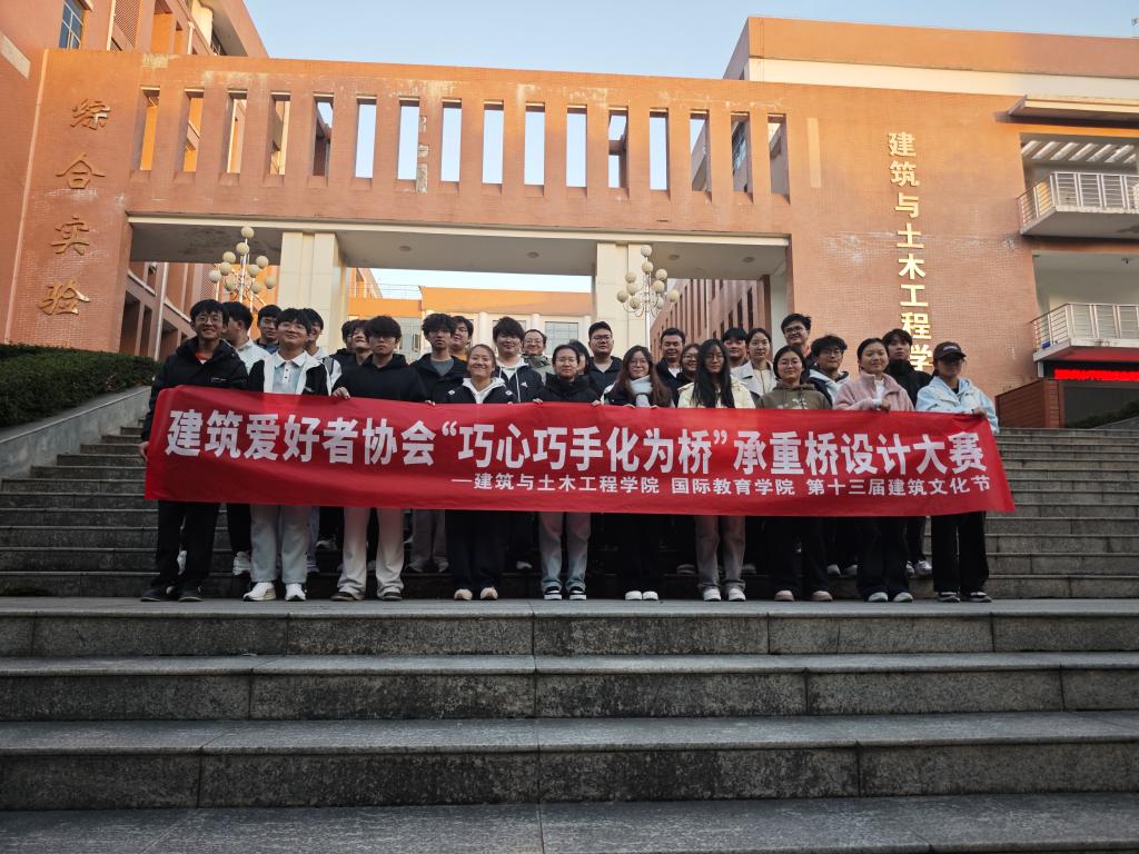 11月25日下午,伟德国际betvlctor1946建筑爱好者协会在综合实验楼小广场举办“巧心巧手化为桥”承重桥梁设计大赛,社团指导老师钱文蹈、社团部分学生以及参赛选手参加活动。